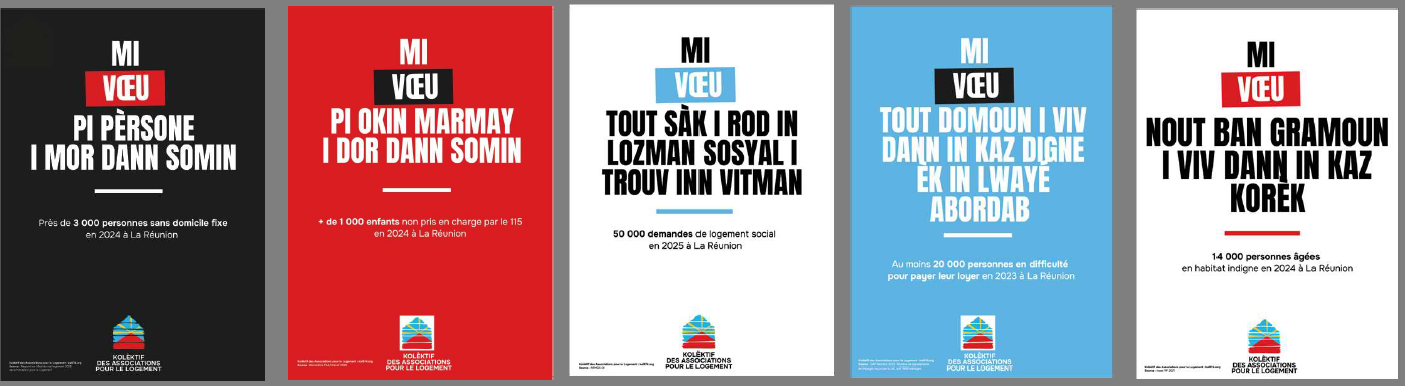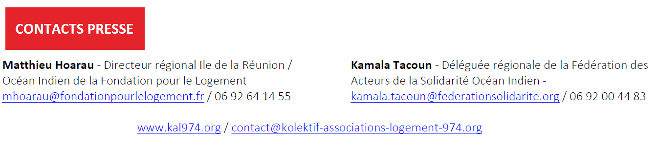 A l’instar du Collectif des Associations pour le Logement qui réunit au niveau national une quarantaine d’associations depuis 2006, la Fondation pour le Logement des Défavorisés (anciennement Fondation Abbé Pierre), Médecins du Monde, Le Secours Catholique, La Cimade, Emmaüs Réunion et La Fédération des Acteurs de la Solidarité Océan Indien, lancent le « Kolèktif des Associations pour le Logement » à La Réunion.
